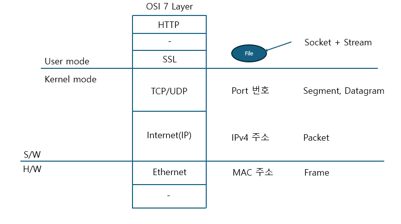 L2 식별자는 MAC Address이고 L3는 IP주소, L4는 port번호이다. 데이터 단위를 애기해보면 L2 데이터 단위는 Frame, L3는 Packet, L4는 TCP는 Segment, UDP는 Datagram이다. L5~L7에서는 socket이란 놈이 등장하는데 이때는 시작은 있는데 끝을 모르는 Stream으로 표현하고 이 끝은 socket 통신을 하는 process가 정하는 Application protocol의 규정에 따른다.