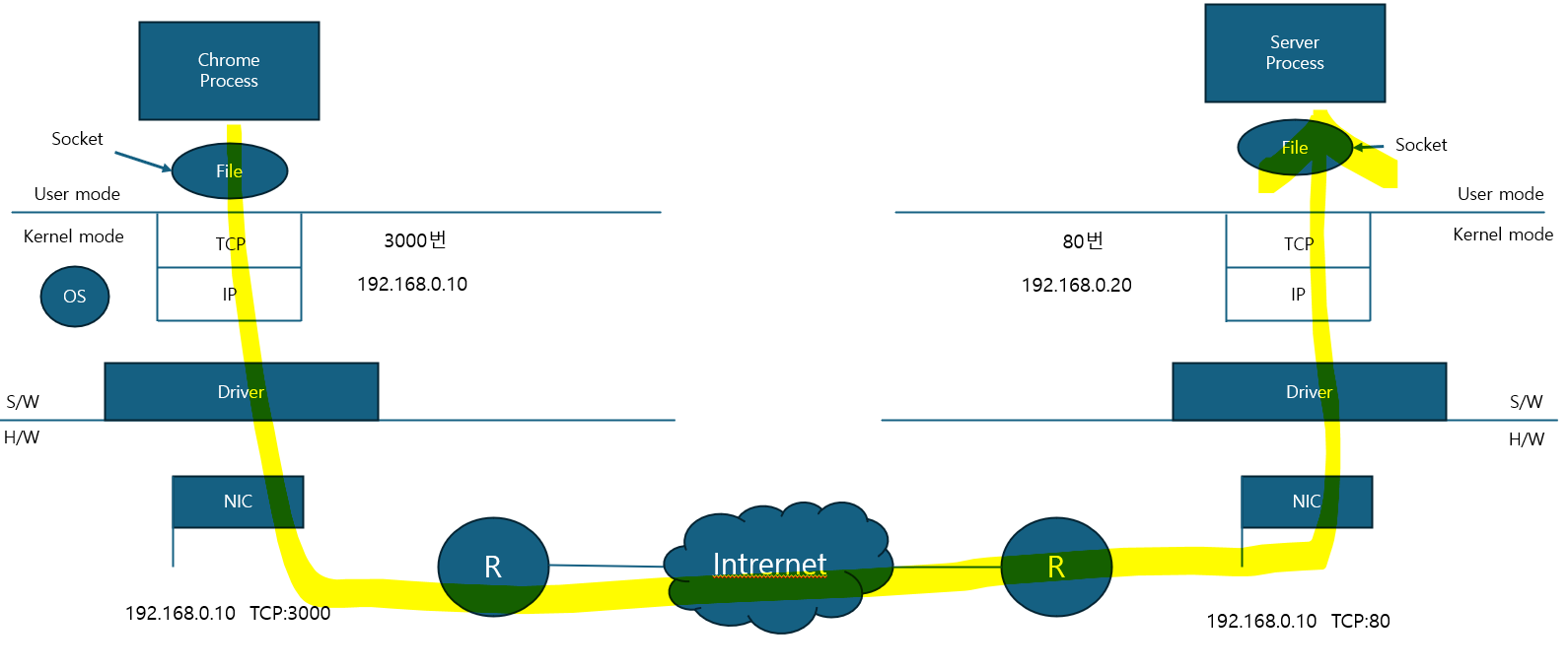 TCP, UDP 통신하는 경우를 조금 자세히 설명하면 TCP는 기본적으로 client와 server로 구성이 된다. client는 active하게 연결을 하는 주체이고 server는 기다리고 연결을 받는다. 클라이언트와 서버 둘다 소켓 인터페이스를 열고 서버측에서는 누군가 이 서버에 접속할텐데 서버는 이를 위해 연결대기상태를 하고 있다. 클라이언트 측에서 프로세스가 소켓을 생성 및 개방하면 OS입장에서 PID를 가진 프로세스 소켓에다가 TCP port번호를 부여한다. 이 때 번호는 OS에서 남는 번호이다. 예를 들어 클라이언트측 IP주소가 192.168.0.10이고 포트가 3000번을 열었고 서버측 192.168.0.20이면 192.168.0.10:3000으로 192.168.0.20에 접속하는거다. 만약 서버가 웹서버면 서버측 port는 보통 80번을 쓴다.