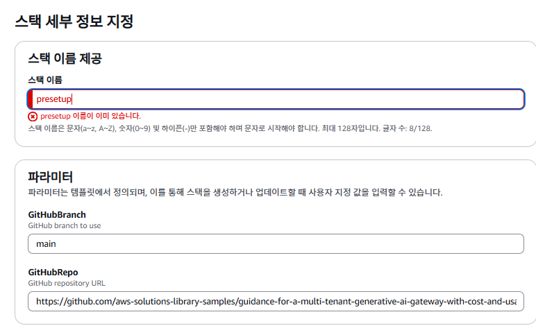 stack name은 presetup으로 해야하고, 밑에 github 은 그대로 둬야한다. 물론 studio 설명대로 하는 것이 당연 좋지만, 가끔 저런 이름을 다른 고유의 이름으로 설정하는 사람이 있을 것이다. 내가 그랬다. 그렇게 stack name을 presetup이 아닌, 다른 이름( SJM-GenAI-Security-Architecture )을 기입하다보니