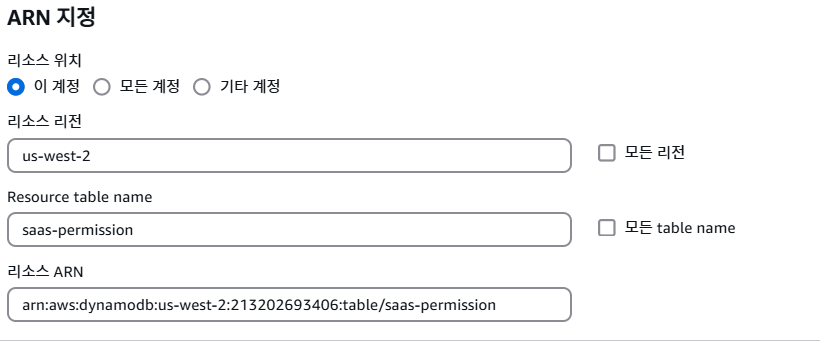 리소스 위치를 특정시키고자, 리소스 리전과 테이블 네임을 ARN 지정란 기입하였다. 그렇게 정책을 만들고