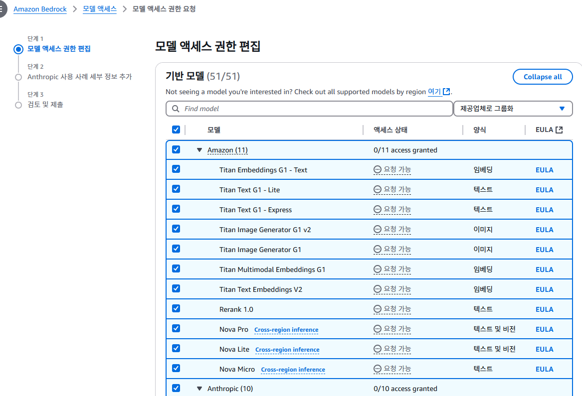 bedrock 서비스에 들어가서 모든 모델에 대한 엑세스 권한도 허용으로 설정해주자