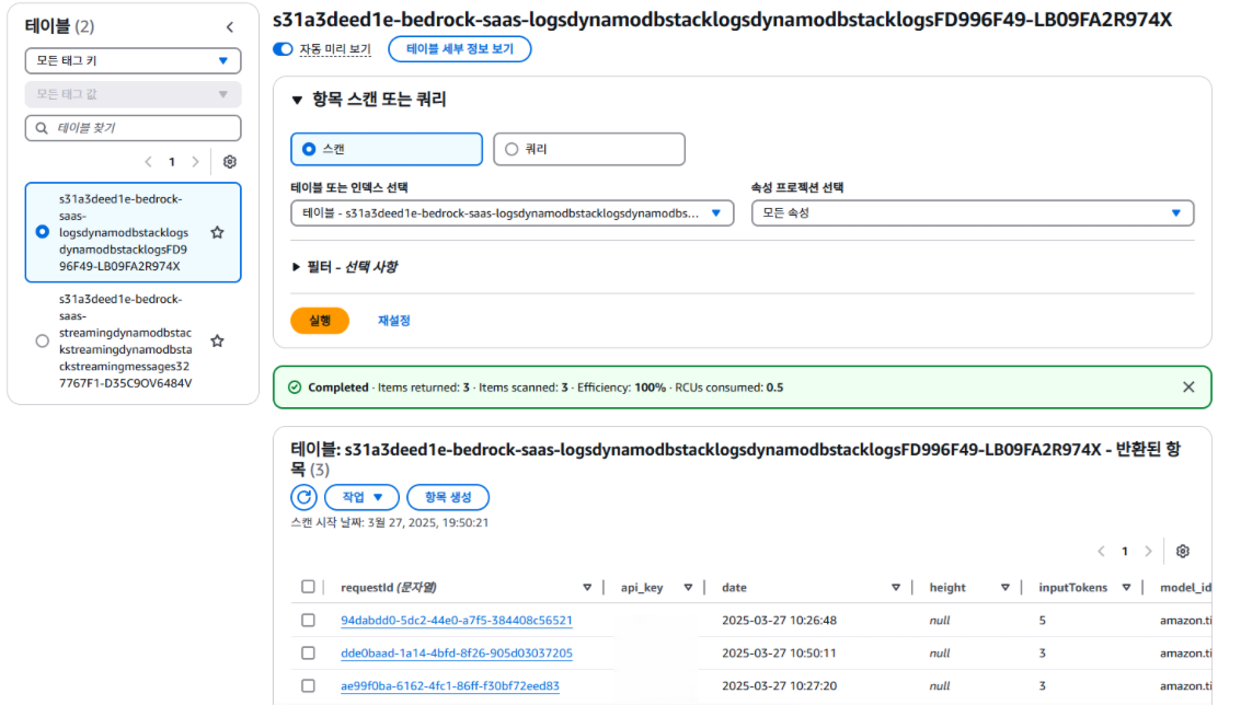 dynamodb의 bedrock-saas-logsdynamodbstacklogsdynamodbstacklogs 라는 테이블에 들어가면 amazon bedrock 호출 이력을 확인할 수 있다. 방금 2번 질문했는데, 왜 이력은 3개나 있냐고 궁금할 수 있을텐데, 저 시간이 10:26으로 나와서 저 테이블이 아닌가? 하고 한 번 더 질문해서 테스트를 해봤기 때문이다. 그러나 시간은 왜 안 맞는지 이해가 안간다. 미국 오리건 주 시간인지 확인해보았다. 오전 3시에서 4시 사이인 시간이라 큰 상관이 없었다.