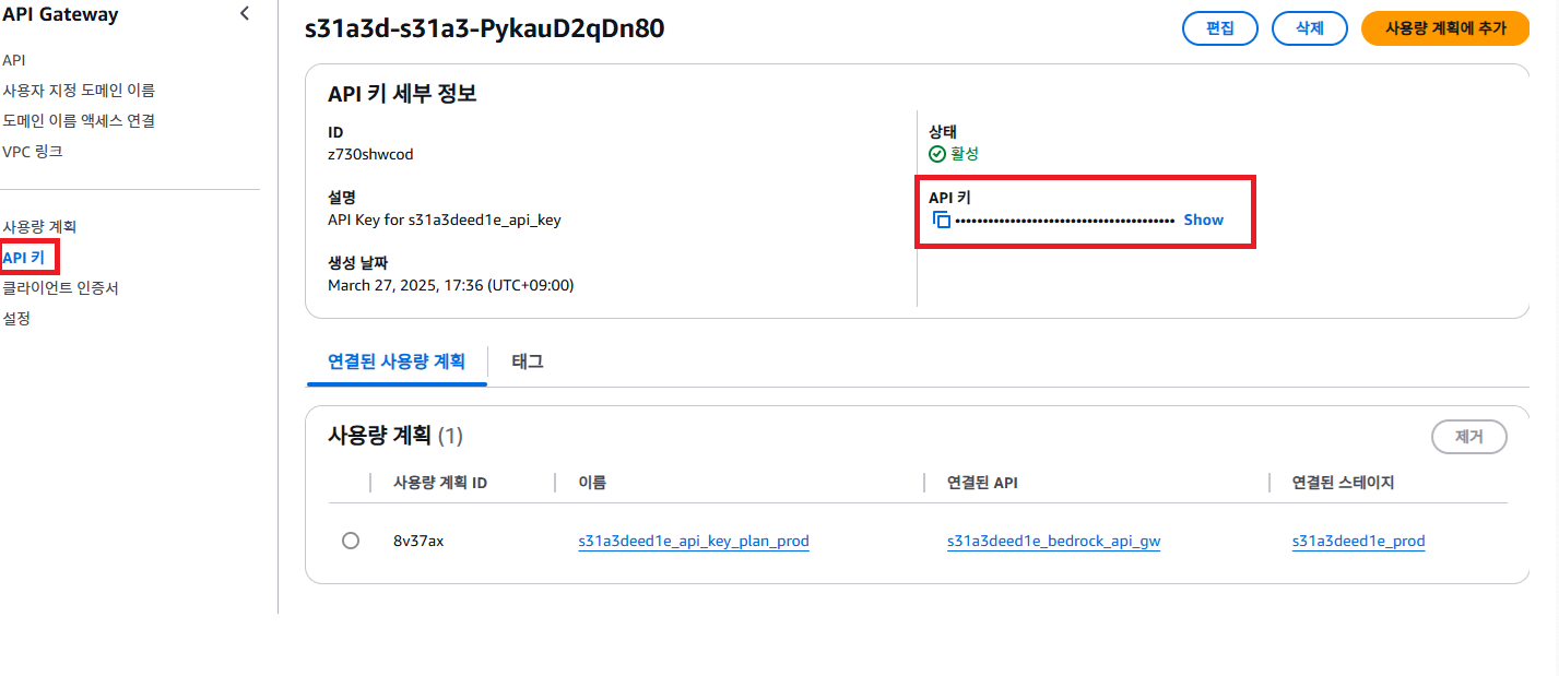 api gateway 서비스에 접속하여, api 키 탭에 가보면, api 키를 복사할 수 있다.