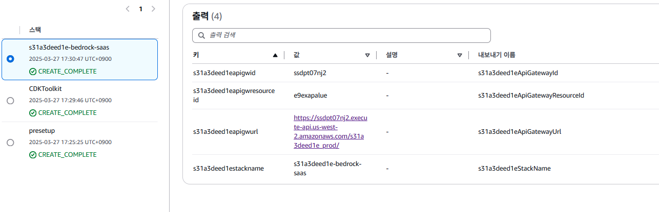 위 그림은 stack name을 presetup, 즉, workstation에서 나오는 설명 그대로 이행했을 때 나오는 화면이다. 따라하닌까 15분도 안걸리고, 저렇게 cdktoolkit과 bedrock-saas stack 생성되는 것을 볼 수 있었다.