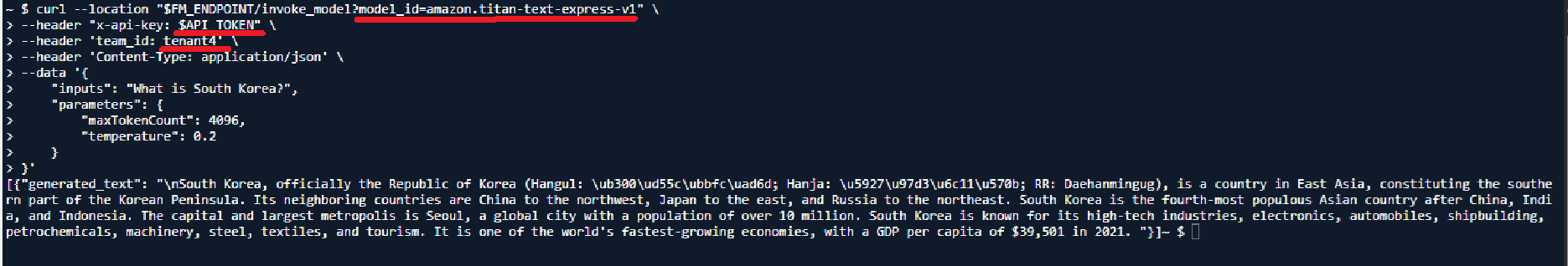 그렇게 적절한 파라미터 값들을 헤더에 삽입하고, What is South Korea 라고 질문을 하였더니, 인증이 통과되서 그런지, 배드록 AI 로부터 답변을 얻을 수 있었다.