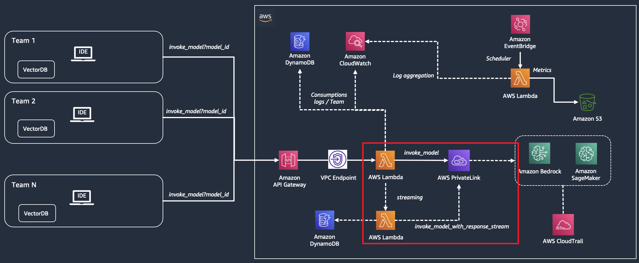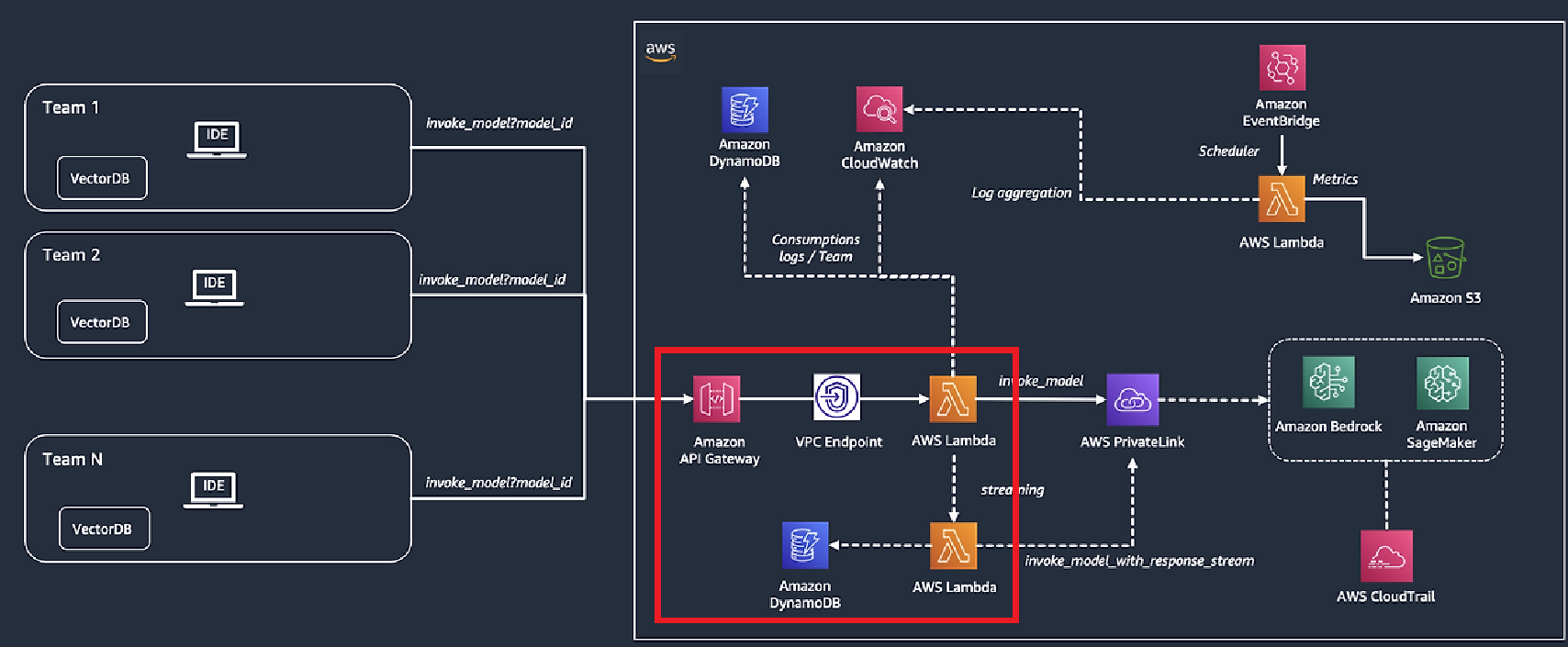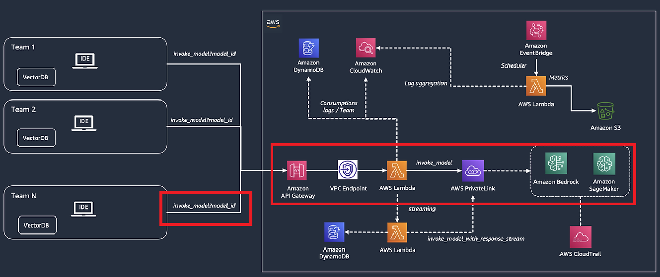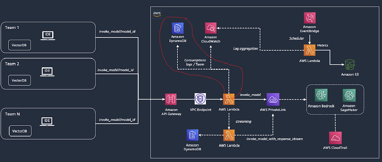 암튼 이 부분은 위 그림의 빨간색 동그라미 친 부분이다. 즉, api 호출이 lambda를 트리거하면, lambda는 배드록 서비스에 관련된 질문을 보내는 것과 dynamo db에 api 호출을 이력으로 남기게 되는 것이다.