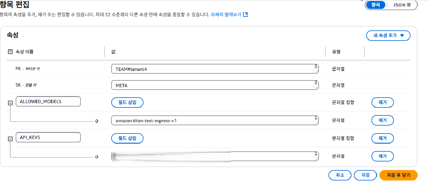 허용 AI 모델은 amazon.titan-text-express-v1 으로 설정하였고, API_KEYS 값은 방금 위에서 본 배드락 api gate의 api의 키 값을 설정하였다. 즉, tenant4 라는 팀 id 를 가진 사람이 amazon.titan-text-express-v1 모델에 방금 테이블에서 설정한 api 키를 들고, 요청을 해야지만 인증이되서 통과할 수 있는 것이다. 즉, 이는 인증을 위한 테이블이고, 해당 테이블을 이용하여 인증 기능을 해줄 람다 함수는 밑에 이어서 작성한다.