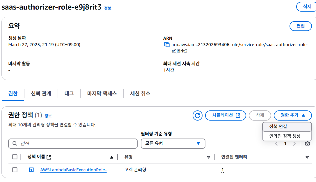 그리고 인증 람다 함수의 권한에 방금 만든 정책을 연결짓기 위해 위 그림에서 처럼 정책 연결을 누르고,