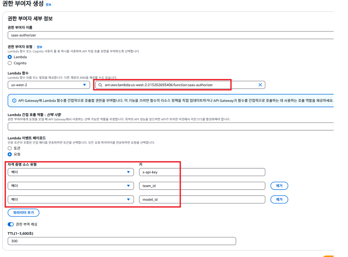 그런 다음, api gateway 서비스에 들어가서 bedrock api gateway에 권한 부여자를 생성해준다. 이때, 람다함수는 방금까지 우리가 만든, 인증 Lambda 함수(saas-authorizer)로 설정하면 되고, 헤더는 저렇게 설정해두자, 그러면 해당 파라미터에 맞춰 인자값만 잘 넣어주면, 람다 함수가 해당 인자 값을 받아, dynamodb 테이블에서 조회한 값하고 비교하여 일치하면 인증에 통과가 될 것이다.