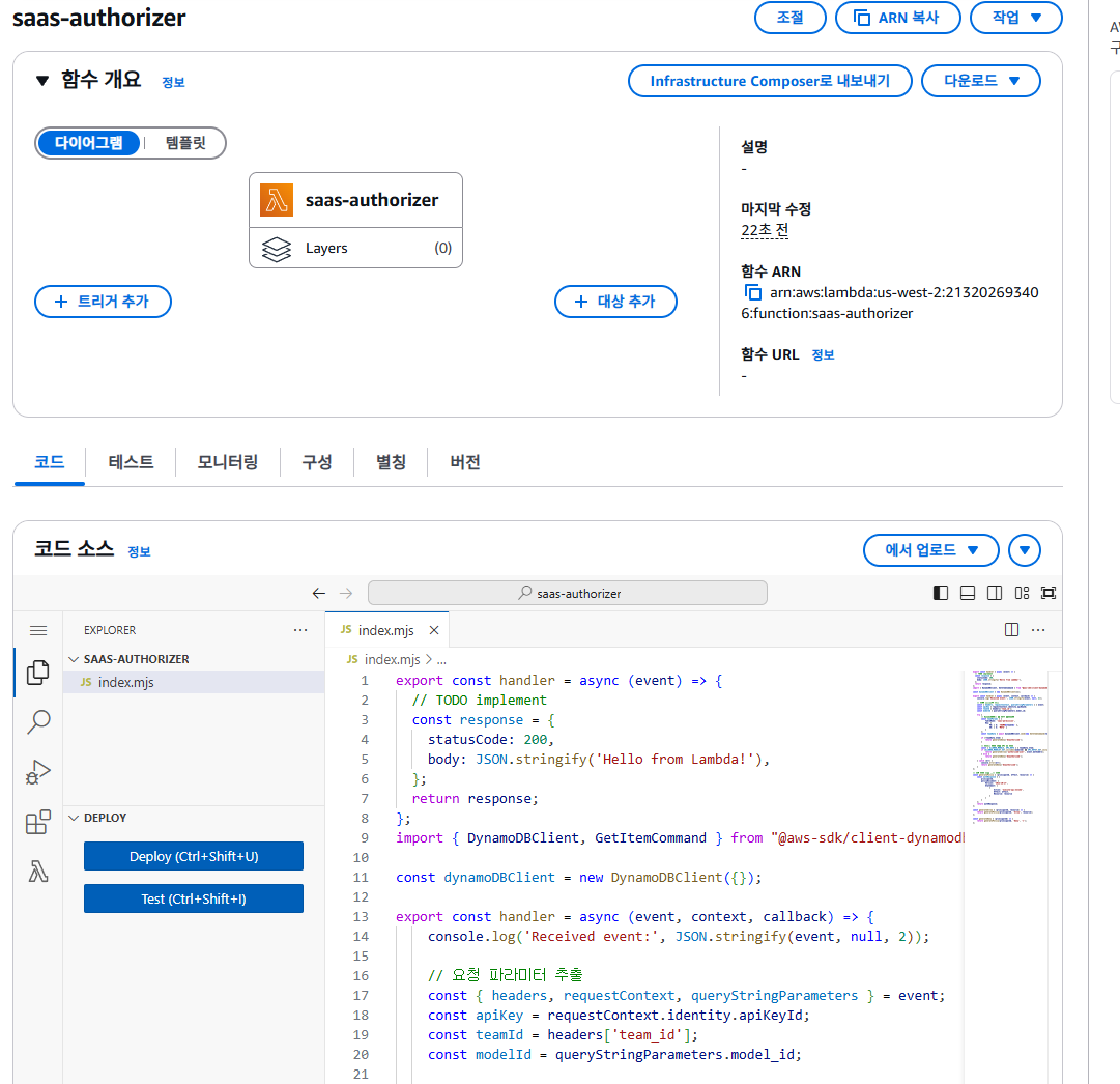 인증 헨들러 람다 함수를 만들어보면 이렇다. saas-authorizer로 이름 지은 다음, 위에서 본 코드를 복사해서 저 코드 탭을 클릭하여 코드 입력란에 붙여넣기 하면 된다. 그런 다음, 옆에 deploy를 눌러서 배포해주면, 해당 람다에 저 코드가 들어가져서 추후에 api 호출시, 저 람다 함수가 트리거될 것이다.