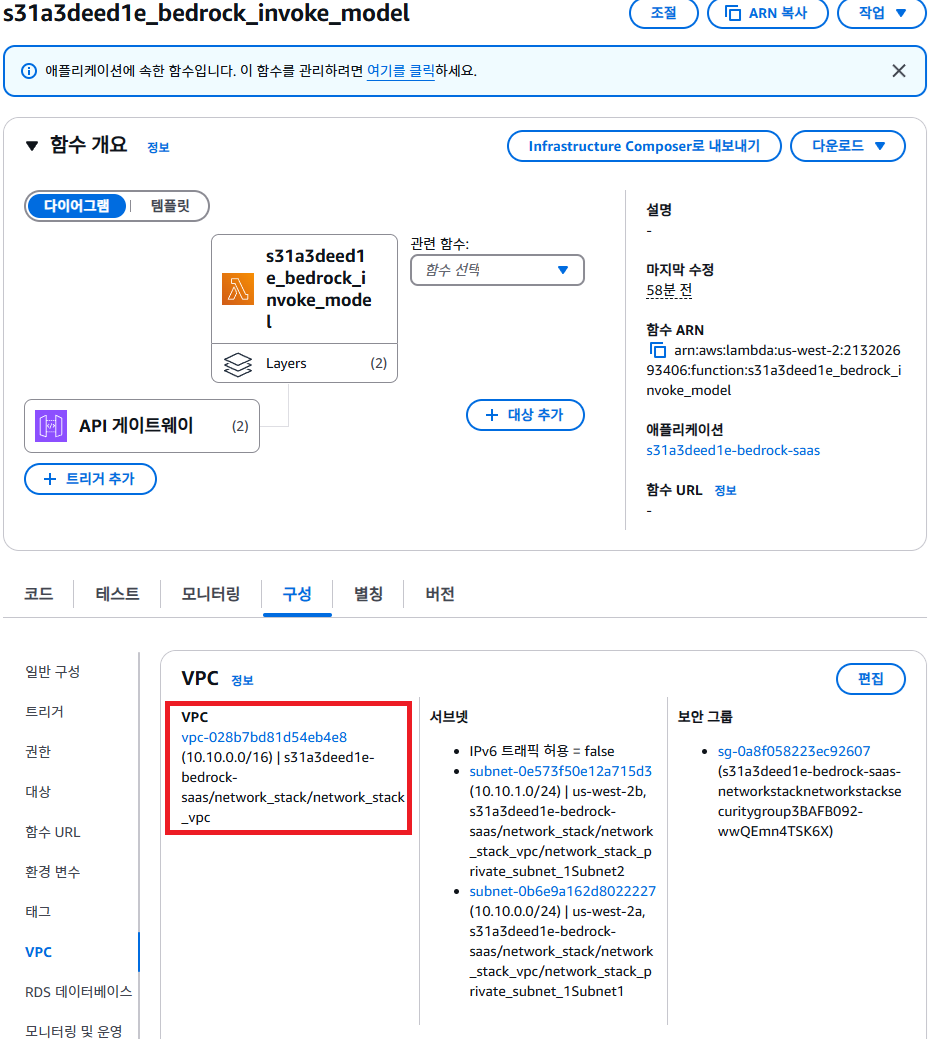 TableName 이라는 키의 saas-permission 만 saas_permission으로 바꿔주고, 추후에 iam서비스에서 lambda가 참조할 테이블의 권한 설정시 ARN 특정 부분에서 saas_permission으로 바꿔주기만 하면 되었다. 물론 매우 귀찮기에, 처음부터 그냥 똑같이 따라해서 이러한 수고를 만들지 말자. 물론 저 API_KEYS 부분만은 앞서 말한 것처럼 본인의 bedrock api gateway api 키 값을 적어야한다는 것을 잊지 말자.