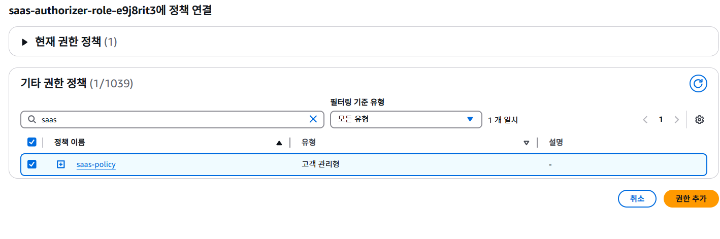 방금 만든 정책을 찾아서 저렇게 체크한 다음, 권한 추가를 누르면, 해당 인증 람다 함수에 dynamo 테이블의 항목들을 조회할 수 있는 권한이 생긴 것이다.
