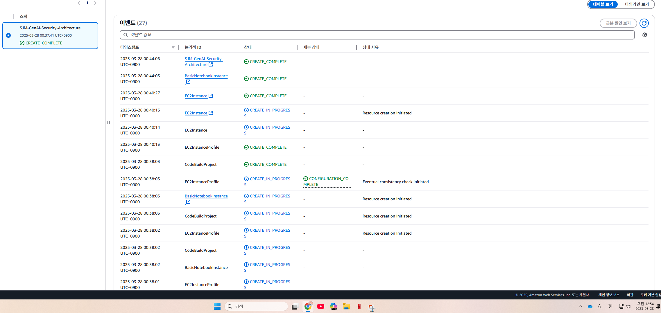 cdktoolkit과 bedrock-saas 스택이 15분이 지나도 나타나지 않았다. 위 그림을 보면, 저 생성 시작 시간을 보면, 00시 37분에 시작했는데, 컴퓨터 오른쪽 아래 시간은 00시 54분이다. 즉, 17분이 지났는데도 cdktoolkit과 bedrock-saas 스택이 생성되지않았다.