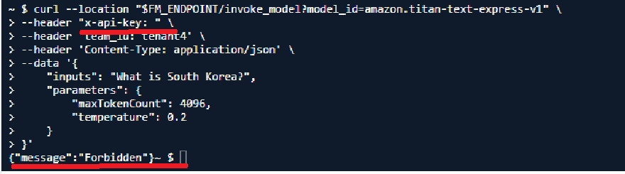 물론 api-key 값을 적지 않거나, team_id가 tenant4가 아닌, 다른 걸 적게되면, 답변을 받을 수 없었다. 즉, 사용자 인증 테스트가 성공한 것을 볼 수 있다. 이처럼, 적절하게 파라미터를 인증 인자 값으로 받아서 람다 함수가 그걸로 dynamodb 테이블의 항목과 비교하는 것을 통해 api gateway에 bedrock 서비스에 대한 사용자 인증 서비스를 구축할 수 있다.