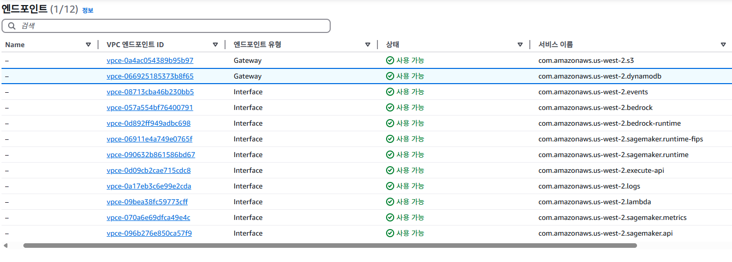 초기 설정이 끝난 뒤, vpc 엔드포인트 목록을 살펴보니, 저렇게 엔드포인트 세팅이 끝났음을 확인할 수 있었다. 이에 따라 lambda 서비스는 위 서비스들을 퍼블릭 노출 없이 endpoint들을 통신할 수 있게 된 걸 알 수 있다.
