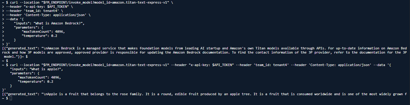 그림 5에서처럼 저렇게 변수를 설정해둔 다음, 그 변수를 이용하여 그림 6에서처럼 api를 호출하여 질문을 해보았다. 처음 질문은 what is Amazon Bedrock?(아마존 배드락 뭐임?), what is apple?(사과가 뭐임?) 이렇게 함 물어보았고, 그에 따라 적절한 답변들을 얻을 수 있었다. 즉 정상 작동이 된다는 걸 확인하였다.