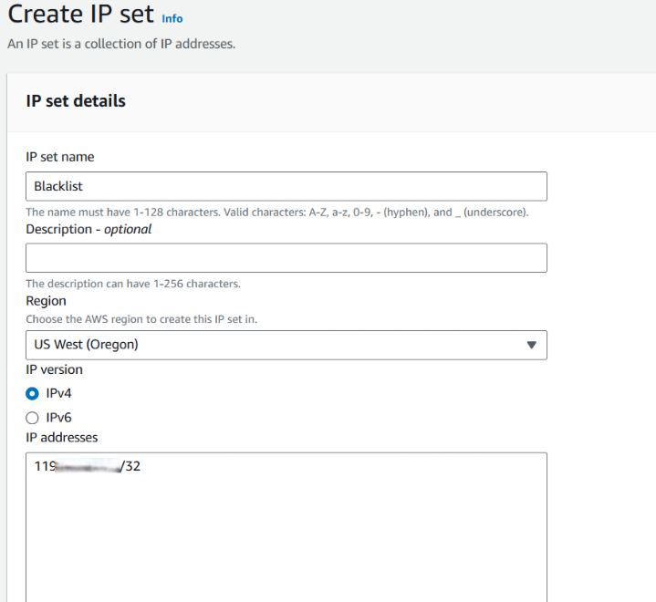 커스텀 탐지 패턴을 만들고자 블랙리스트를 만들고자 IP Sets에서 블랙리스트라는 이름을 가진 IP set에 IP 주소를 나의 IP 주소로 설정하였다. 여기서 주의할 점은 리전을 US West 주로 해야 방금 설정해둔 waf가 있는 곳에 IP set을 사용할 수 있다. waf 서비스가 글로벌 서비스로 등록되어 있다만, Web ACL 즉, access control list 가 담긴 사용하고자 하는 waf는 그 리전에 귀속되어 사용하기 때문이다. 이 또한 설명하는 이유가 workshop studio에서는 region을 us west가 아닌, seoul 리전으로 선택하였고 이는 잘못된 설명이라 이를 정정하고자 이렇게 따로 설명한 것이다.
