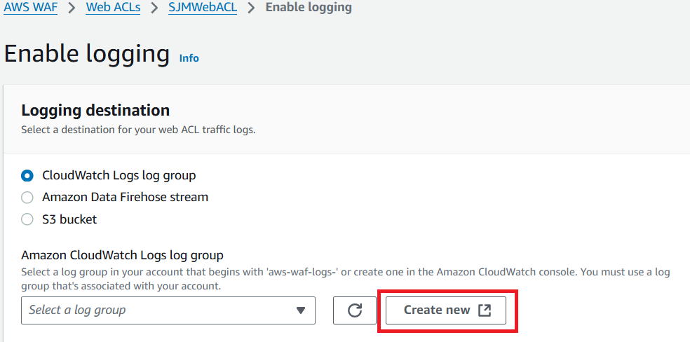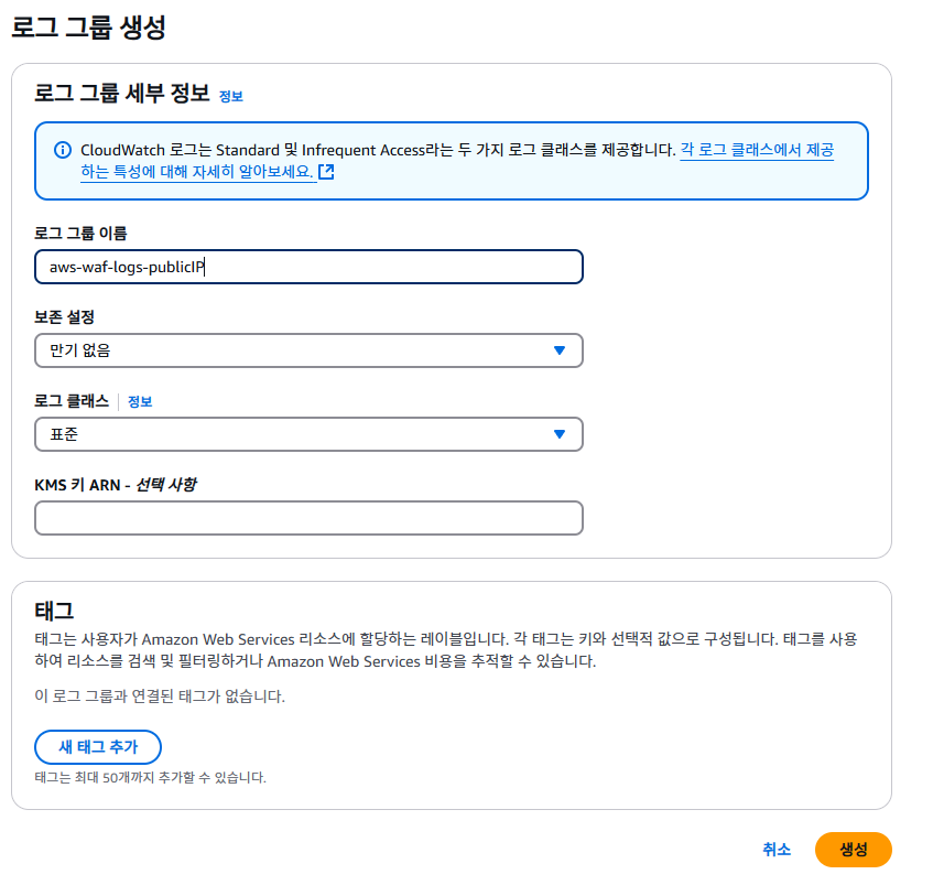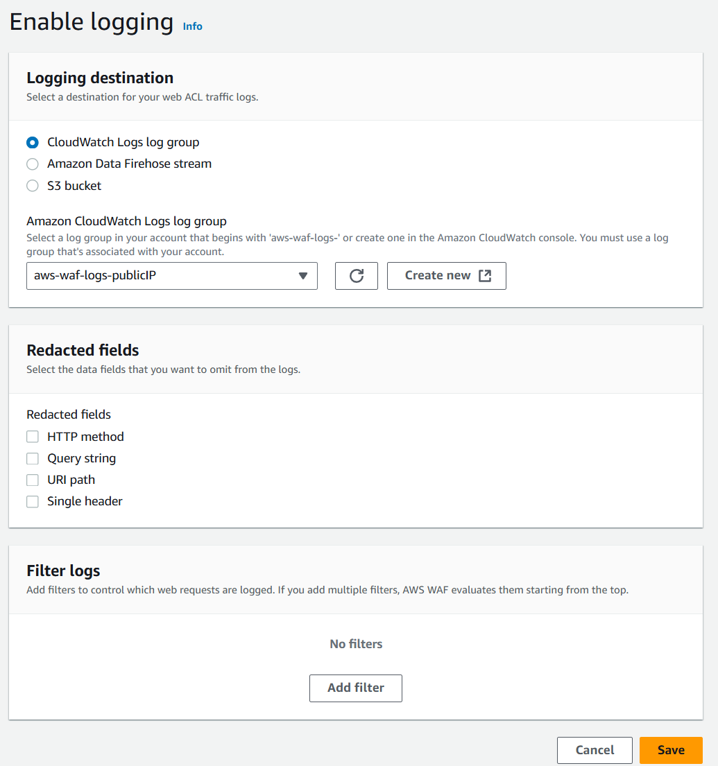 방금 만들어둔 로그 그룹이 나타난 것을 볼 수 있으며, save를 눌러 저장한다. 이때 주의할 점이 aws-waf-logs- 이라는 이름으로 시작해야 해당 로그 그룹이 선택란에 떠서 선택할 수 있다. 안그러면, 만들어둔 로그 그룹이 안떠서 양식에 맞게 다시 만들어야 한다.