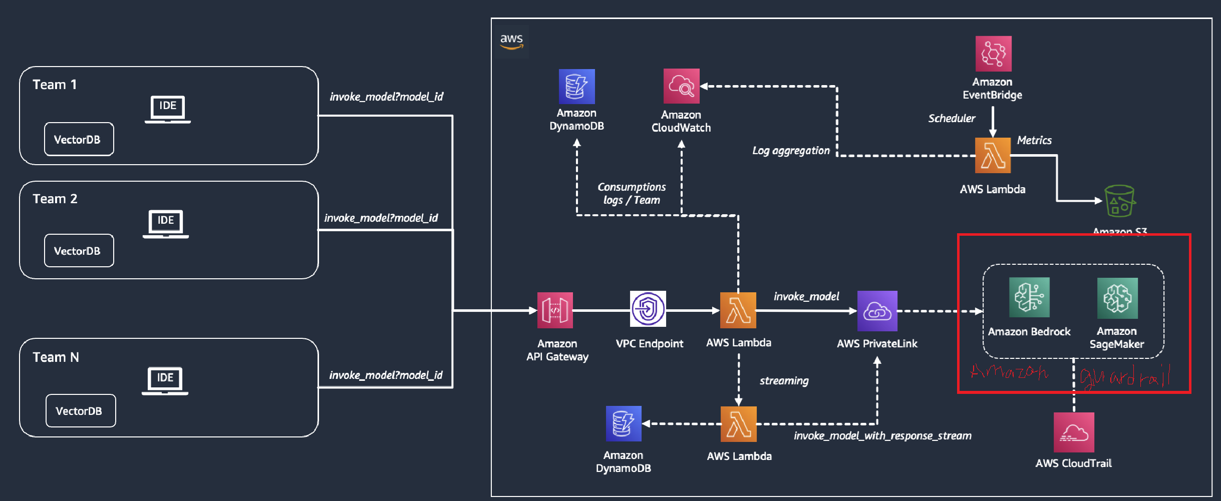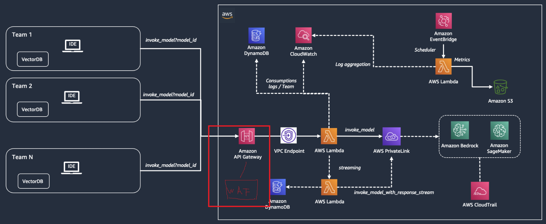 아마존 가드레일을 해당 아키텍쳐에 표시한다고 하면, 아마 저기가 되지 않을까 싶다. 뭔가 amazon bedrock 서비스를 전체적으로 감싸서 검사하는 느낌이 들어서 저렇게 표시해두었다.