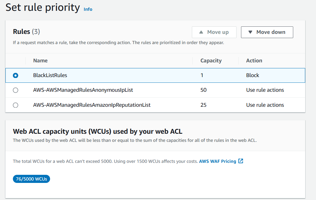 그 다음 탐지 룰셋의 우선 순위를 정해둔다. 그런 다음 딱히 더 건들 것은 없기에 create web acl을 눌러 waf를 만들어주면 된다.