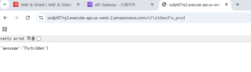 그리고 cloudshell 이용해서 똑같이 테스트한 결과, 같은 응답 결과를 받은 것을 확인함으로써 제대로 필터링된 걸 cloudshell을 통해서도 확인할 수 있었다.