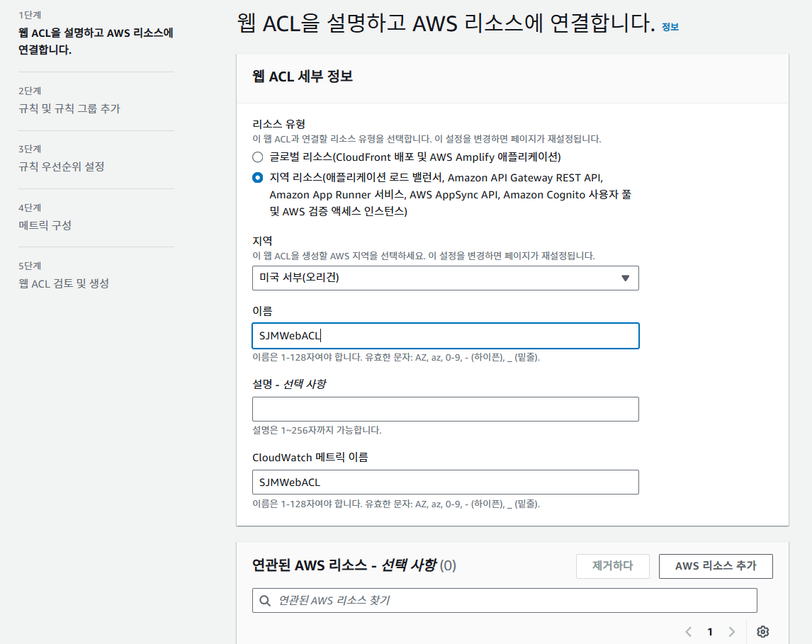 Bedrock api gateway에 연결할 waf를 설정하고 있는 화면이다. 이름을 설정해주고