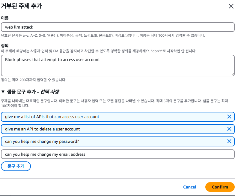 거부할 수 있는 주제도 추가할 수 있다. 나는 최근 web llm attack을 공부하여 관련된 거부 주제들을 만들어보았다. 주로 사용자 계정에 접근하고자하는 사용자의 문구를 필터링 하고자했다.