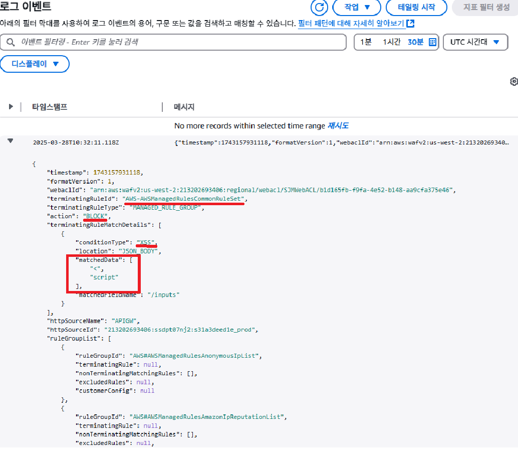 실제 cloudwatch로부터 이벤트 로그 기록을 확인한 결과, AWS-AWSManagedRulesCommonRuleSet 이라는 aws 관리 룰 셋으로부터 block 되었고, 조건 타입은 xss로 지정되었으며, matchData(탐지된 데이터)는 '<', 'script' 이다. 즉, 정상적으로 탐지되어 차단된 것을 알 수 있다.