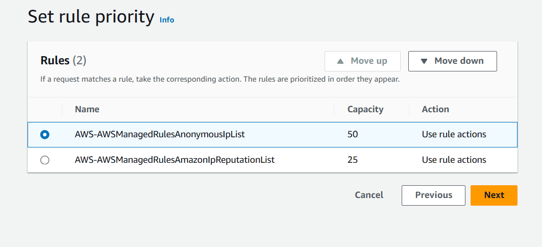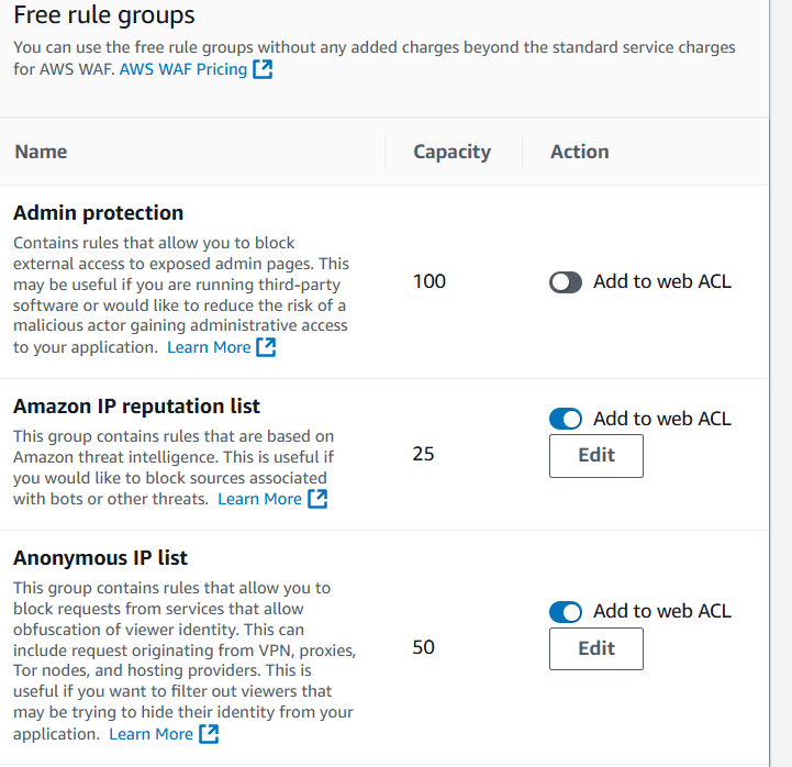 그러나 무료 탐지 룰 그룹들도 있어서 이걸 활용하면 된다. work studio shop에서 나온 것처럼 amazon ip reputation list와 anonymous IP list를 선택하였다.