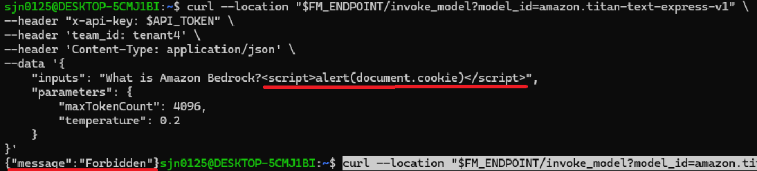 ubuntu 리눅스에서 테스트를 해보았다. what is Amazon Bedrock? 이라고 물어본 뒤, <script>alert(document.cookie)</script> 이라는 스크립트를 삽이하였고, 그대로 전송해보았다. 그 결과, Forbidden 즉, waf로부터 막혔는지 차단 메시지를 받았다.