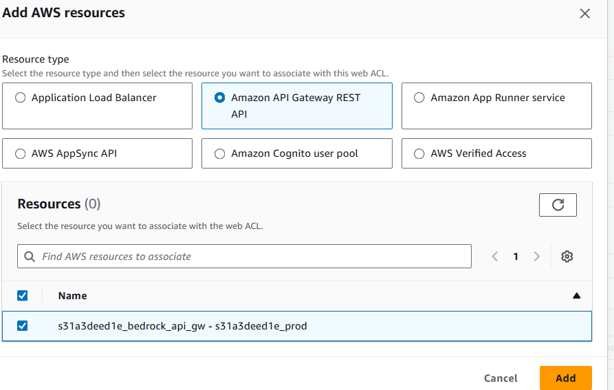 연결할 api gateway로 나의 bedrock api gw에 연결하고자 연관 리소스로 등록해두었다.