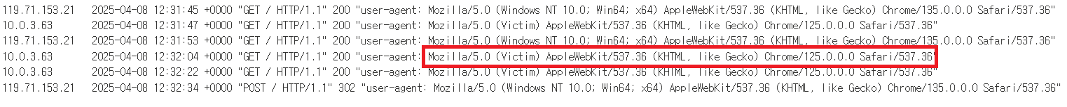 그리고 내 공격 사이트의 엑세스 log를 살펴본 결과, 내 ip(119.~) 이외 10.0.3.63 이라는 IP를 가진 다른 사용자가 접근한 것을 볼 수 있었다. 즉, 해당 포스트를 클릭한 것으로 인해 내가 남겨둔 댓글 속 이미지를 요청하기위해 내 공격 사이트에 접근 하게되었고, 그로인해 접근 로그 기록이 저렇게 남게된 것이다. 암튼, 저 사용자의 user-agent의 값을 가져와서