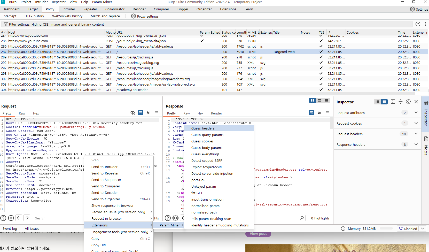 - Param Miner는 이 리스트에 있는 각 항목을 대상 요청에 하나씩 삽입하거나 수정하며 서버에 전송한다. 예를 들어, HTTP 헤더에 X-Host: test를 추가하거나, Origin: https://example.com을 넣는 식으로 요청을 변형한다.