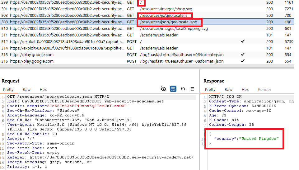 그리고 그 응답이 앞 단계를 거쳐 결국, j.country 라는 것을 통해 json 응답에서 country 라는 key를 불러와 값으로 "United Kingdom" 을 불러오는 것이다. 그런데 위 그림을 잘 보면, innerHTML 사용하고 있다. 즉, 문자열이 아니라 HTML 코드 자체로 파싱되는 것을 알 수 있다. 이는 DOM XSS 공격을 제대로 살릴 수 있는 취약한 코드이다. 즉, /resources/json/geolocate.json 데이터 안에 "country": 라는 키의 값으로 태그를 활용한 악성스크립트를 삽입하면 된다.