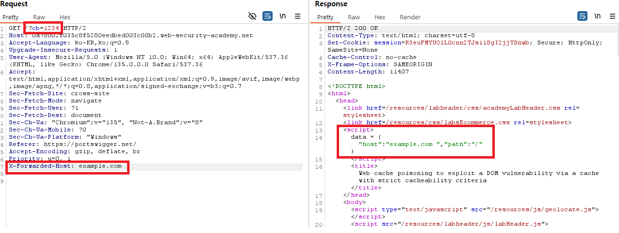 요청 파라미터에 cb=1234 를 삽입하여 캐시버스터를 만들어 캐시 포이즈닝 테스트를 돌려보고자 했고, X-Forwarded-Host: example.com 를 요청 헤더에 삽입하여 응답을 살펴보았다. 그 결과, 응답 헤더의 스크립트 부분을 보면,