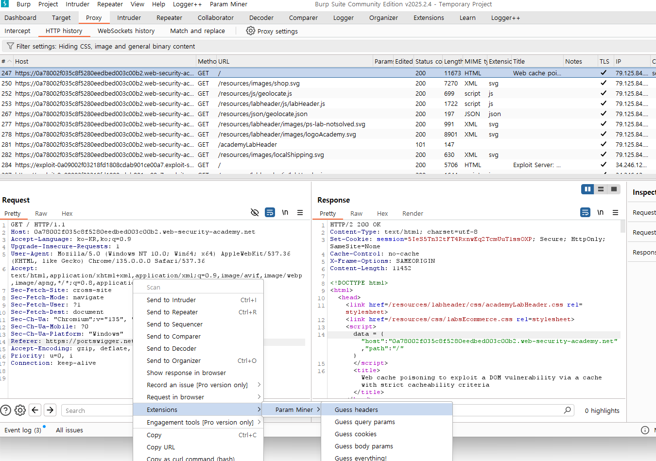 이번 공격도 캐시 포이즈닝 어택에 쓰일만한 취약점이 있는지 확인하고자 대상 서버 홈페이지에 param miner 툴을 적극 활용해봤다.