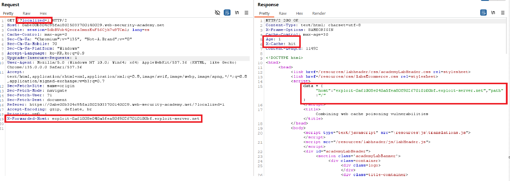 그리고 그 결과, 위 그림과 같이 X-Forwarded-Host: exploit-0a61008e040a5fea80f90267010100bf.exploit-server.net 라는 헤더를 삽입하고, 리다이렉팅 되는 곳의 웹 캐시를 포이즈닝 하고자 /?localized=1 이라는 URL로 설정하였다. 그 결과, response 영역을 보면, data 영역의 host 부분에 방금본 악성 호스트 네임이 삽입된 것을 볼 수 있고,