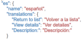 크게 보면, 언어별 키워드를 큰 key로 잡고, 이에 대한 value로 name과 tanslations 라는 키로 잡은 다음, 또 그 각각의 value로 저렇게 나와있다. 즉, 번역 목적 언어의 풀네임은 name 이라는 key에 저장되고, 실제 번역은 "Return to list", "View details", "Description:" 이라는 문자열이 번역 목적 언어로 번역되는 것이다. 영어는 해당 페이지의 원어이기에 굳이 tanslations 이라는 key는 만들지 않은듯하다.