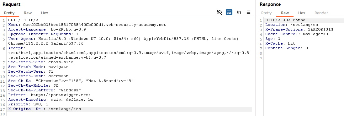 그래서 일부러 틀리게 적었다. /setlang///es 라고 말이다. 그랬더니, /setlang/es로 리다이렉팅 캐시 설정 성공하였다. 그 이유는 CDN 같은 프록시가 X-Original-URL을 그대로 백엔드로 전달하고 백엔드는 그 경로를 정규화해서 /setlang/es 로 리디렉션하였고, 그 /setlang/es는 캐싱된 것이다. 좀 더 자세히 말하자면, 기존 GET /setlang/es는 이미 캐싱된 설정이고, 그걸 프록시가 그대로 받아 우리한테 곧바로 전달하므로 캐시 포이즈닝을 할 수 없었다. 그러나 /setlang///es는 처음 보는 경로니까 프록시는 캐시 키가 없어서 백엔드로 전달하게된다. 백엔드는 내부적으로 전달받은 URL을 정규화해서 /setlang/es처럼 처리함. 프록시는 그 응답을 받고, 처음 본 키(/setlang///es)로 새로 캐시하게 되는 것이다. 그래서 캐시 포이즈닝에 성공하게된다.