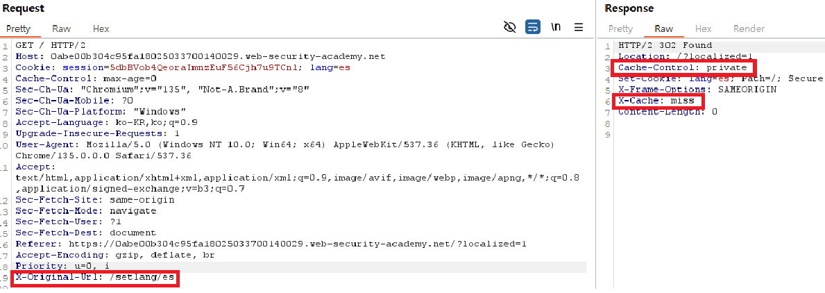 이를 위해 중간 지점인 /setlang 이라는 경로를 이해해야한다. 왜냐하면 여기서 리다이렉팅이 일어나기때문이다. 참고로 요청헤더에 X-Original-URL 이라는 헤더가 있다고 해도 CDN에서 해당 요청 경로에 대해 백엔드가 처리할 수 있는 경로라면 굳이 리다이렉트 해주지 않는다. 따라서 리다이렉트 해주는 저 지점을 공략해야한다. 그러나 처음 시도때는 캐시미스가 떴다. 이 경로는 보안상 민감한 동작을 하므로 일반적으로 캐시하지 않는다고 응답 헤더의 Cache-Control: private 그걸 명시하고 있었다.