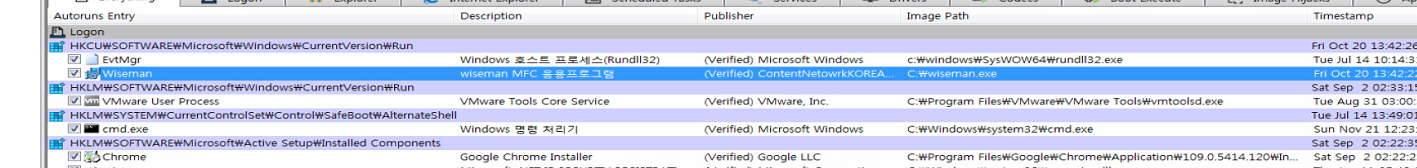 - Run 실행 파일안에 EvtMgr와 Wiseman 레지스트리 값이 추가