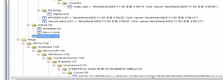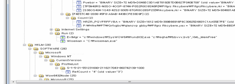 - 파일: 네트워크 세션 및 쿠키 값 설정, wiseman.exe 실행 파일 추가 생성, Run 실행 파일안에 EvtMgr와 Wiseman 레지스트리 값 추가 생성