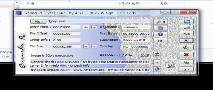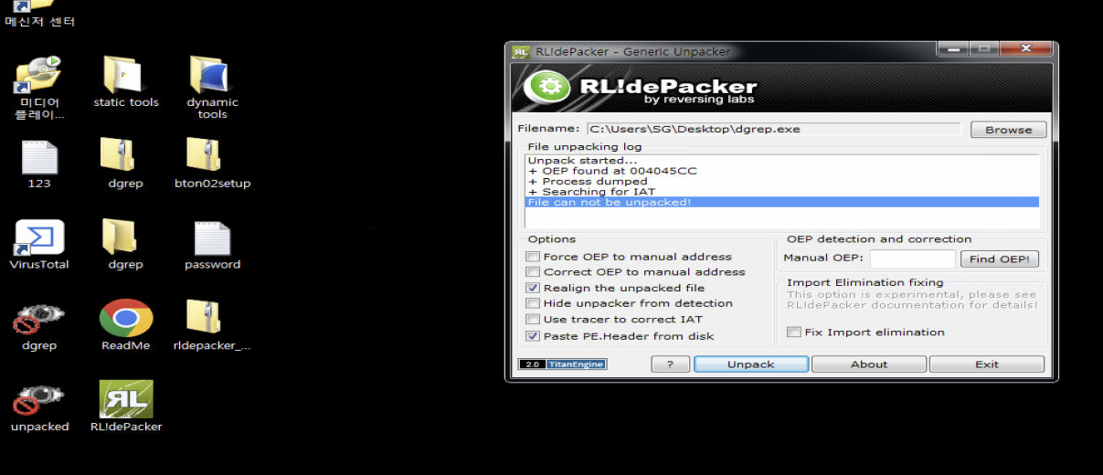 - RL!dePacker를 설치 후, dgrep 파일을 언패킹 처리 후, unpacked 라는 파일이 생성