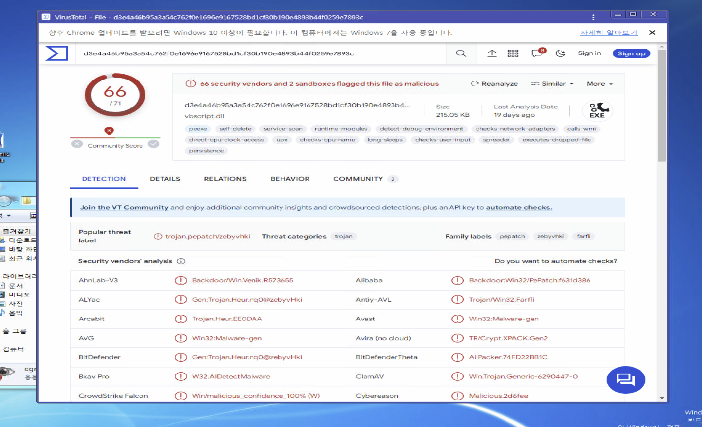 - 바이러스 토탈에서 조회시, 트로이목마로 추정하며 해당 악성코드로 방향성 잡기 시작