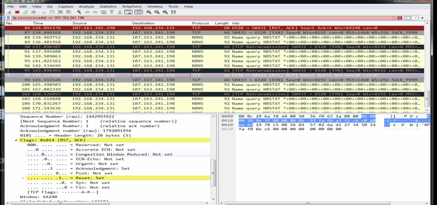 - wireshark에서는 패킷 필터를 이용하여 살펴봤더니 해당 IP와의 통신시도 확인