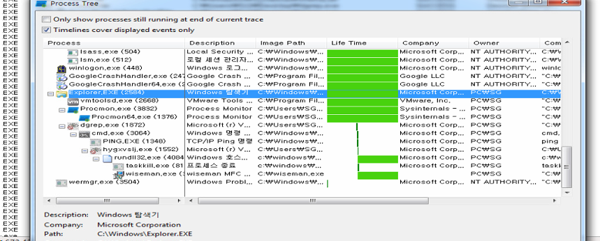 - 프로세스: rundll 함수를 통해 wiseman 프로그램 실행과 그와 관련된 자식프로세스 생성 및 ping 명령어 등을 확인