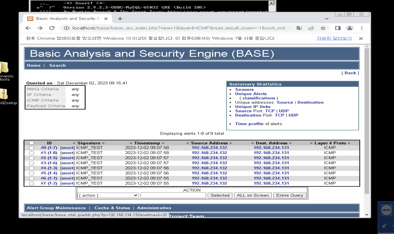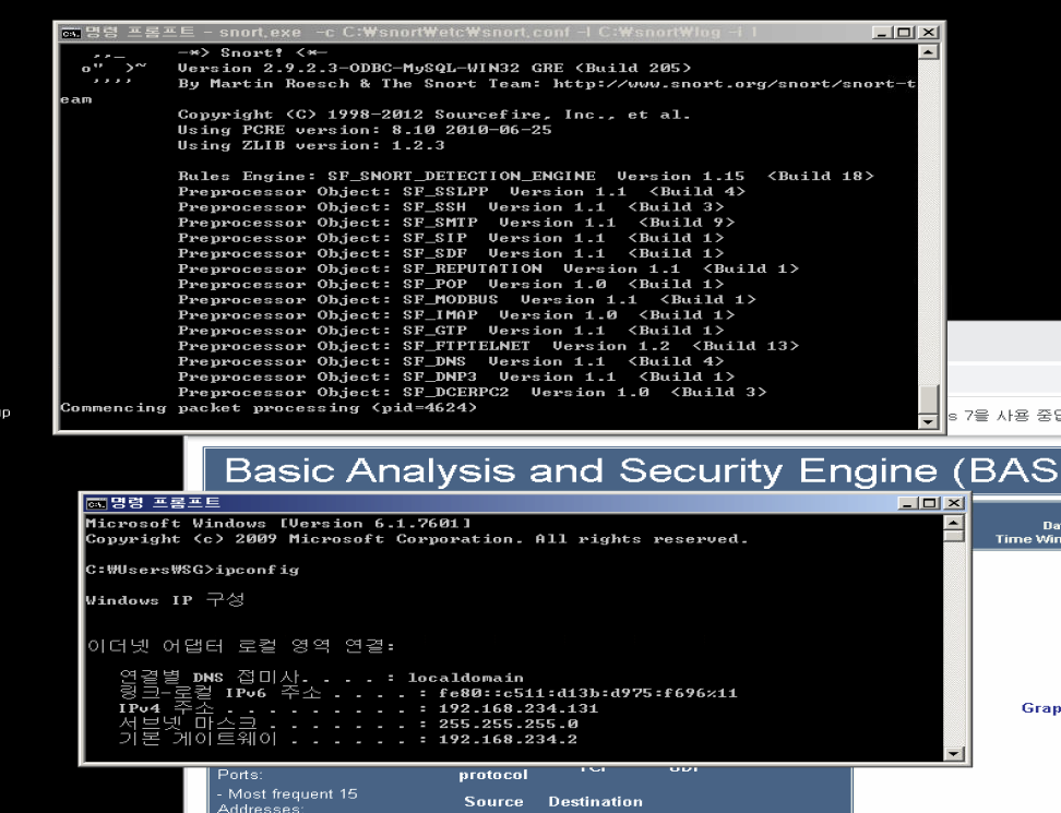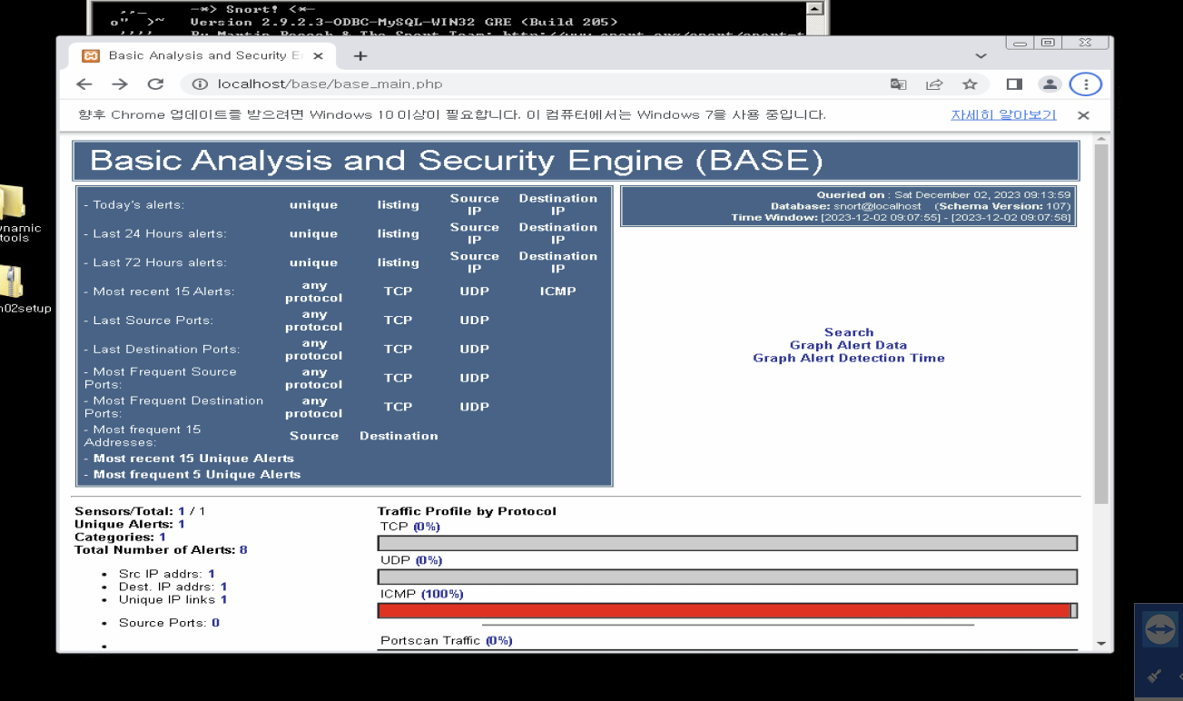 - 그러면 base 프로그램이 adodb5 라이브러리를 이용하여 snort db에 접근한 뒤, 저장된 탐지로그를 불러와서 웹 프론트엔드상에 집계를 해줌